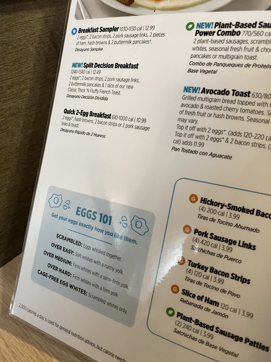 One egg* your way, 1 bacon strip, 1 pork sausage link, 1 thick-cut piece of ham, hash browns & 1 buttermilk pancake.